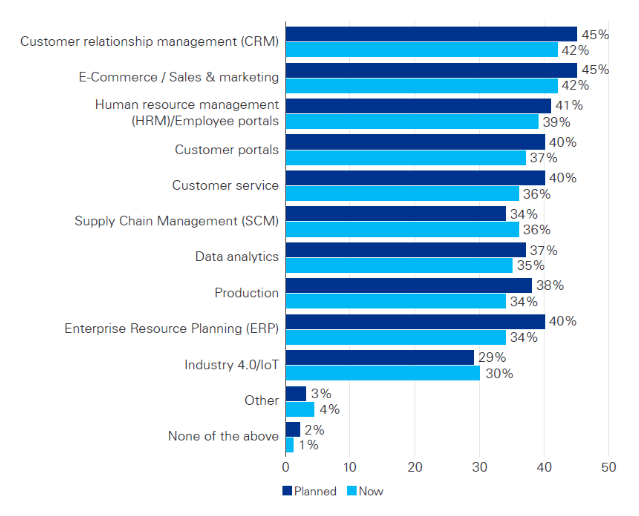 O gráfico abaixo mostra quais são as áreas das empresas/processos onde estão sendo implantadas aplicações com desenvolvimento low-code. De entre todas as áreas de implantação, CRM e comércio eletrônico/vendas e marketing são as mais comuns, ambas com 42%, seguidas pela gestão de recursos humanos. Em todas as três categorias, mais de 40% das empresas que não usam low-code hoje têm planos de adotá-lo.