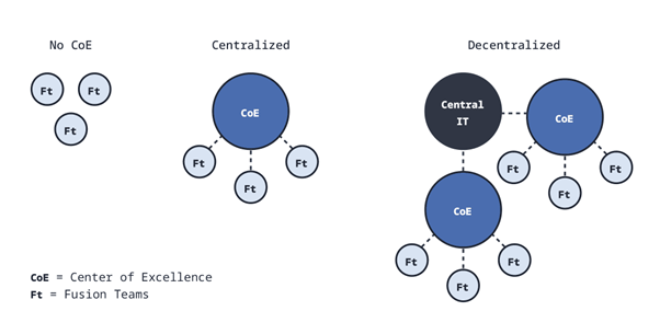 Construir seu Centro de Excelência Low-Code é uma coisa. Mas uma consideração estratégica surge com a forma como você posiciona o CoE dentro da sua organização. Você deseja usar um modelo centralizado ou descentralizado? O diagrama abaixo ilustra ambos: